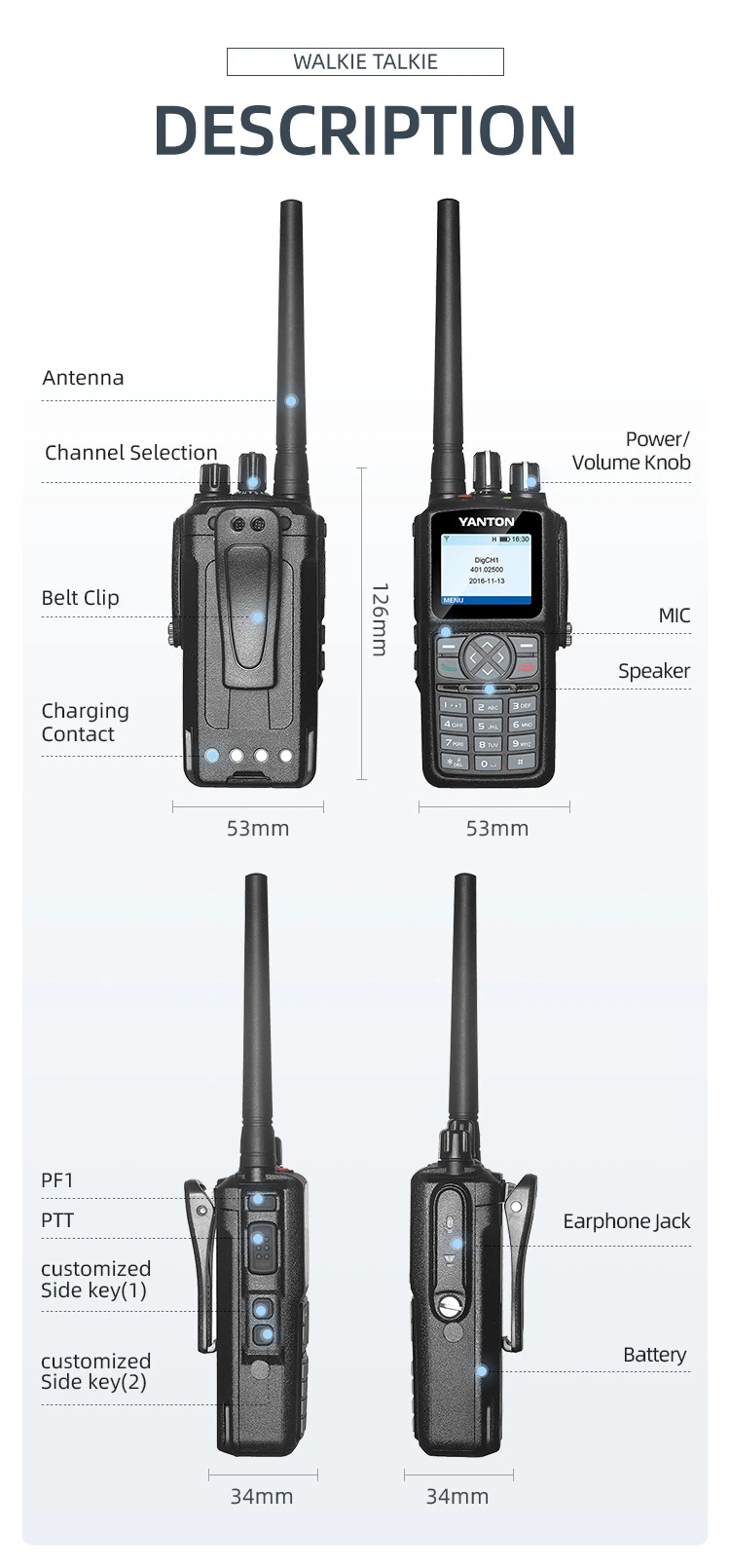 DM-980 DMR walkie-talkie with diaplay color.Built for dual-mode (Digital+ Analog),Tier1&Tier2 compatible motorola,single band 136-174MHz/400-480MHz,support Versatile Voice Call (Private call, group call, all call and emergency call),compatible with other DMR radios and talkback; with high/low power settings, maximum power is 5W, minimum power is 1W.You can use Digital encryption and SMS function.